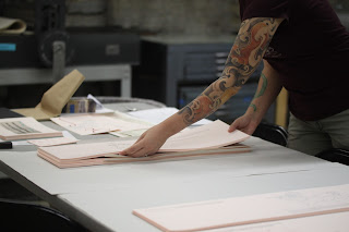 Then the printing began. My job is simple: catch the prints, stack them without smudges. Mostly, it's company-keeping, and I've found Meryl and I have really lovely opportunity to talk--dig in about poetry, manuscripts, project plans, travel (AWP), the like. It makes me hope she has many, many more of these projects and her husband has to go out of town for a bit so I can spend some time talking. Stories to the rhythm of a Vandercook.